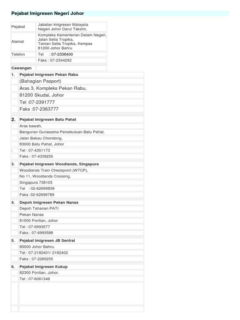 Johor Immigration Contact Info