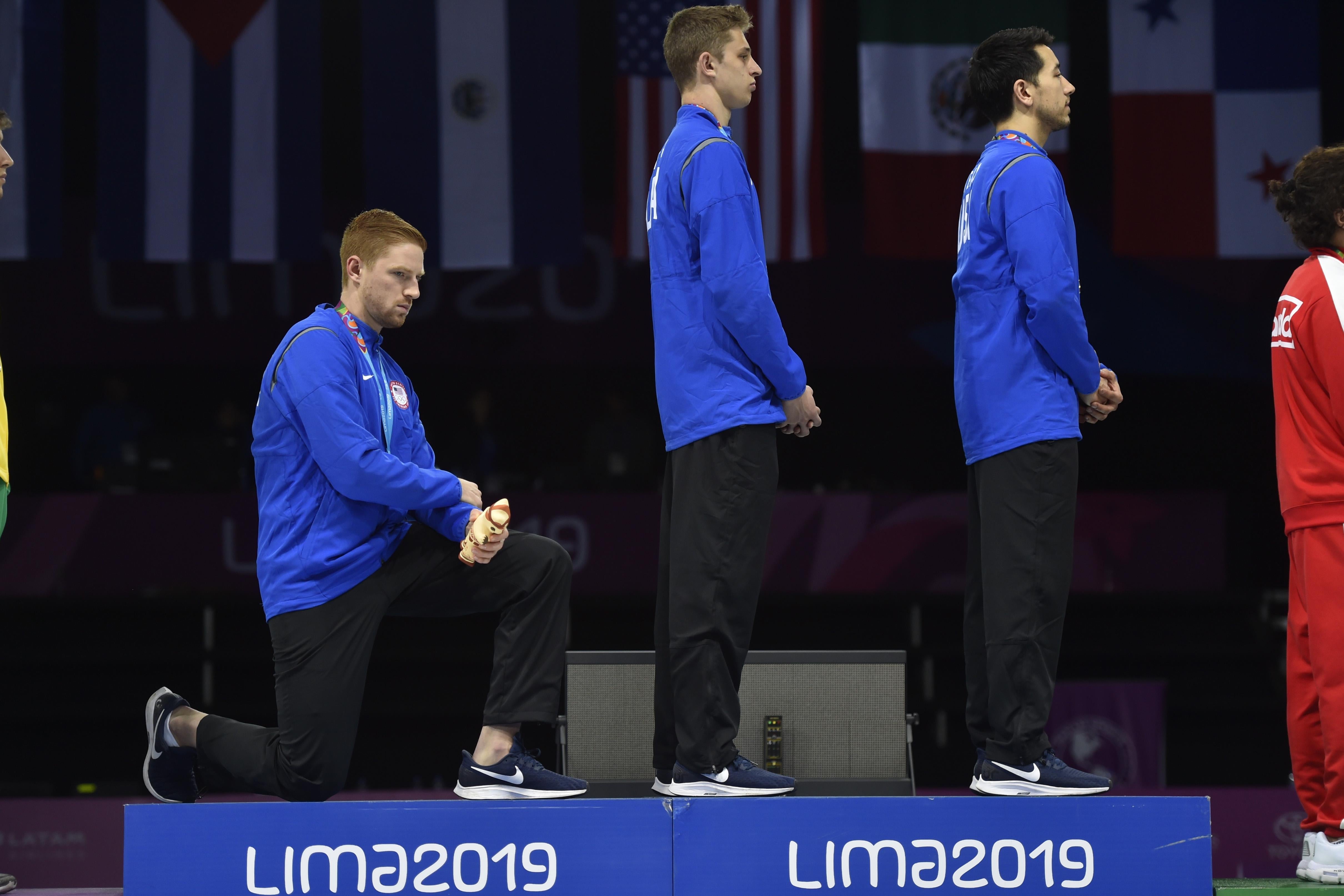 Olympic fencing medalist race imboden took a knee in protest of social injustice in the u s. Men s fencing team took a knee during the star spangled banner on friday at the pan american games in lima peru.